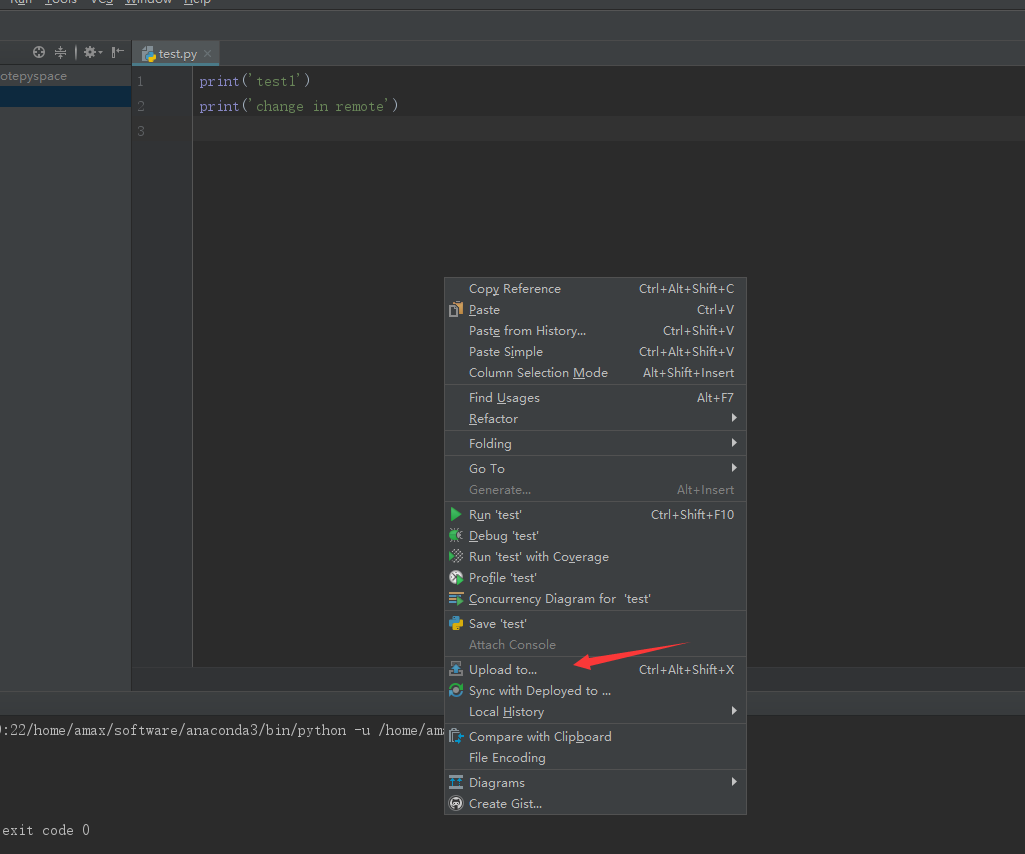 - 在本地(这个本地是你在配置Deployment时设置的本地文件夹)修改你的代码,修改完成后在编辑区域或者文件名上右键,选择upload to...来提交到服务器。
