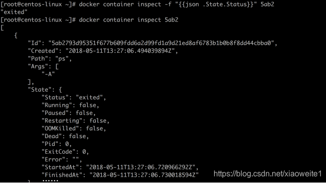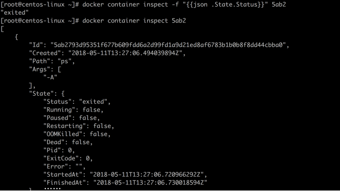 命令格式: docker container inspect [OPTIONS] CONTAINER [CONTAINER...] 或者 docker inspect [OPTIONS] CONTAINER [CONTAINER...]