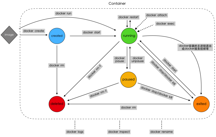 容器和虚拟机的生命周期比较相似(创建、运行、暂停、关闭等等)。