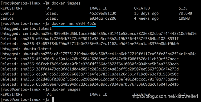 命令格式: docker rmi [OPTIONS] IMAGE [IMAGE...] 或者 docker image rm [OPTIONS] IMAGE [IMAGE...]