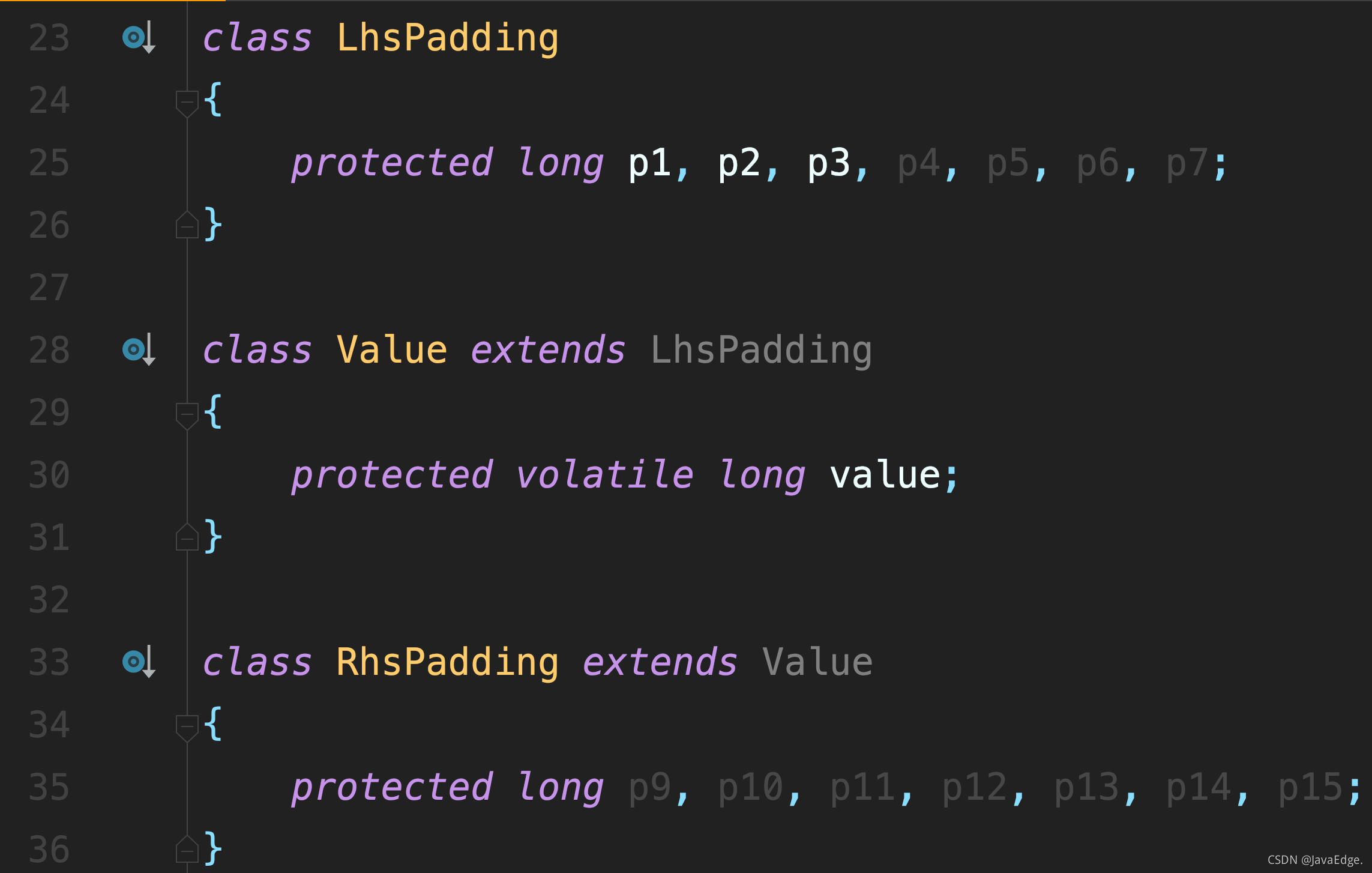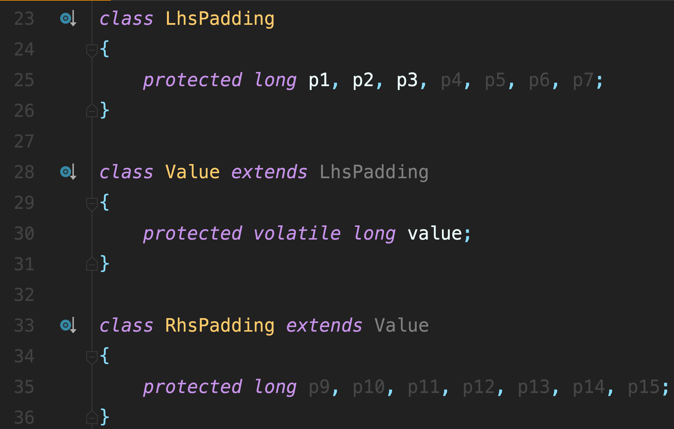 Disruptor缓存行填充中的填充字段。Disruptor中的一个元素是个volatile long类型,占用8字节。