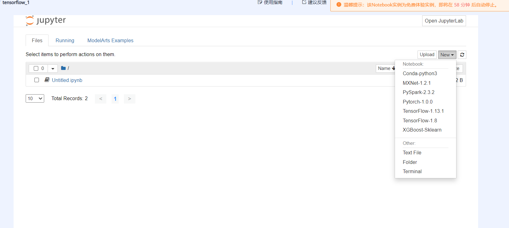 创建好Notebook后,新建一个文件(即点击new),选择tensorflow-1.13.1,创建成功后就可以开始写代码啦。