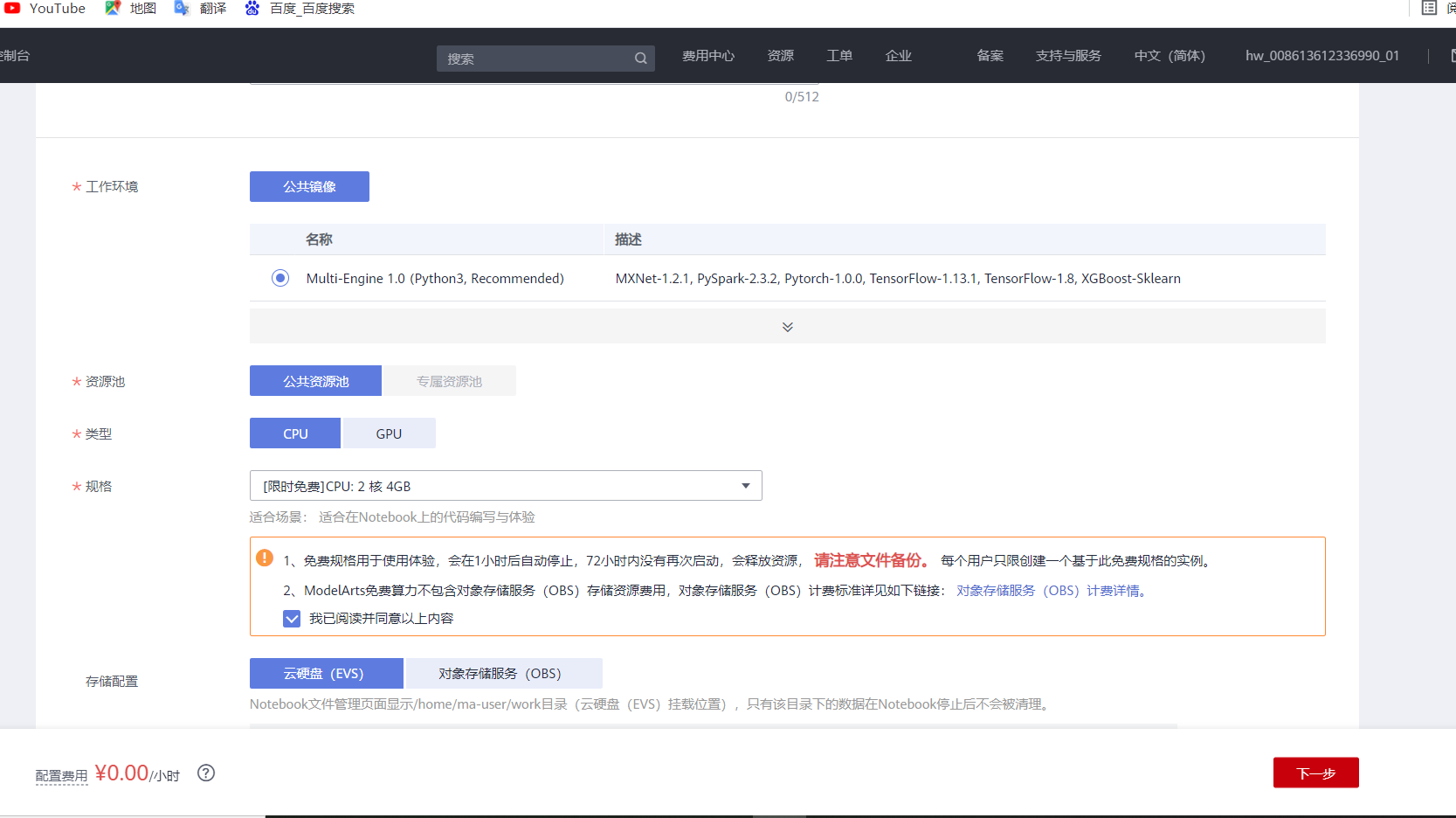 项目名称自拟,工作环境选择第一个(只要包含tensorflow的1.x.x版本即可),类型选择CPU2核8G,资源池选择公共资源池,储存配置选择云硬盘。