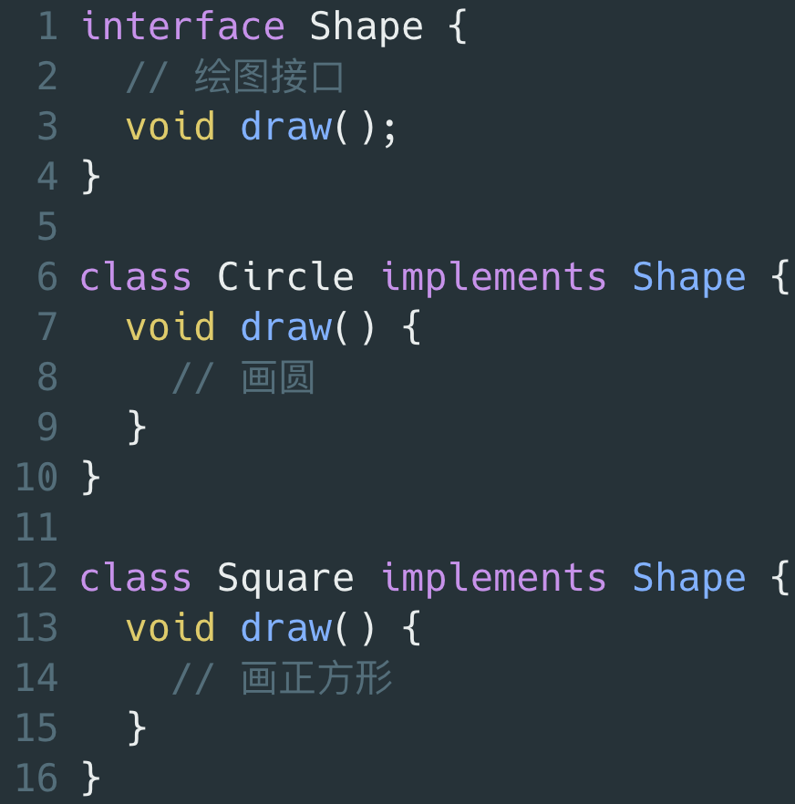 构建出的抽象会以接口(此处接口不一定是个语法,而是一个类型的约束)体现。所以,本文讨论的多态范畴内,接口、抽象类、父类等概念等价,统一称为接口。