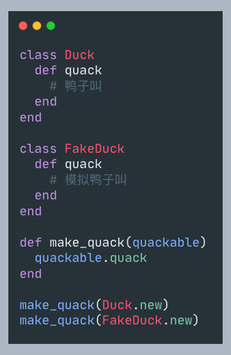 动态语言中一个常见说法 - Duck Typing,若走起来像鸭子,叫起来像鸭子,那它就是鸭子。