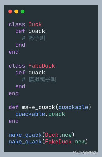 如下代码段:Duck和FakeDuck不在一棵继承树上,但make_quack调用时,它们俩都可传进去。