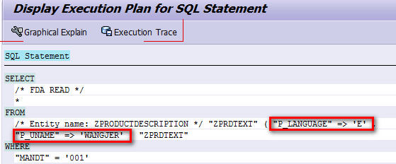 这一点我们可以通过使用事务码ST05得到的trace里得到确认:在运行时P_LANGUAGE被赋以了sy-langu的值E,而P_UNAME被赋以sy-uname的值WANGJER.