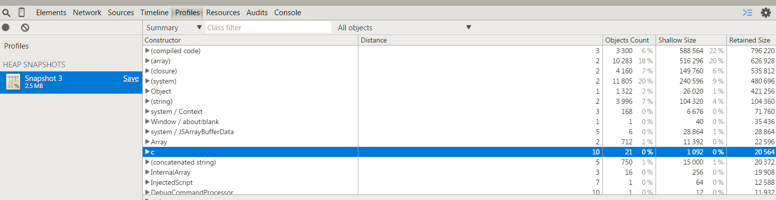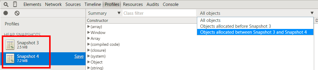 继续以调试mode执行代码到第16行,点击按钮"Take heap snapshot"以生成第二个snapshot。从下拉菜单里选择"Objects allocated between Snapshot 3 and Snapshot 4":