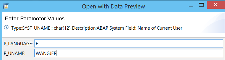 当我们在ABAP Development Studio里预览该view时, 我们会被要求给这两个参数指定值: