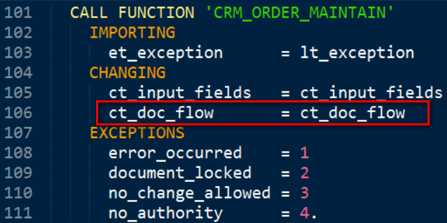 代码的核心就是使用CRM One Order的function module CRM_ORDER_MAINTAIN, 把document flow相关的数据传入到changing参数ct_doc_flow里。
