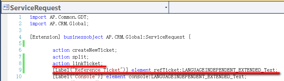 1. 在Ticket的BO ServiceRequest上创建一个新的action linkTicket用于实现关联逻辑。同时创建一个新字段用于存储需要关联的Ticket ID: