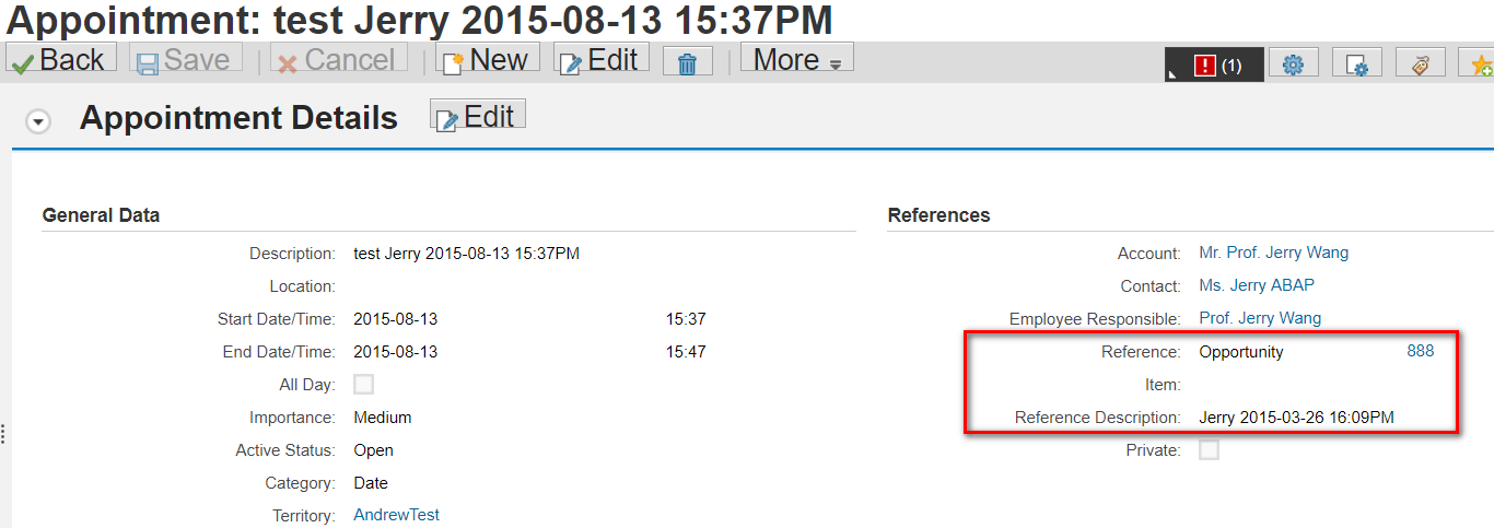 以一个具体的例子来说明。在Appointment的Overview page上能看见一个名叫Reference的区域,这里可以维护一些其他的业务文档的ID,这样可以将该业务文档同当前正在编辑的Appointment关联起来。