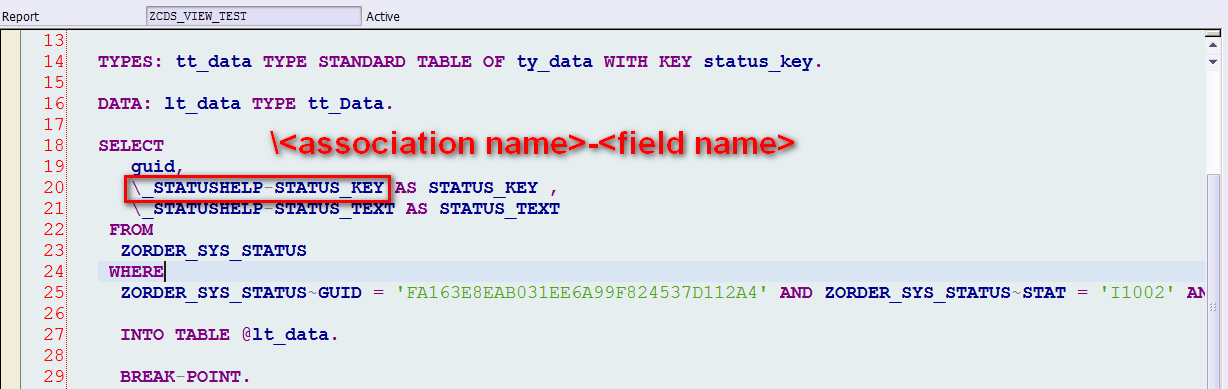 DATA: lt_data TYPE tt_Data. SELECT guid, \_STATUSHELP-STATUS_KEY AS STATUS_KEY , \_STATUSHELP-STATUS_TEXT AS STATUS_TEXT FROM ZORDER_SYS_STATUS WHERE ZORDER_SYS_STATUS~GUID = 'FA163E8EAB031EE6A99F824537D112A4' AND ZORDER_SYS_STATUS~STAT = 'I1002' AND \_STATUSHELP-STATUS_KEY IS NOT NULL INTO TABLE @lt_data.