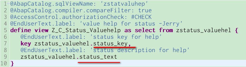 我有如下一个CDS view, 这个view的数据来自CRMD_ORDERADM_H, 定义了一个名称为_statushelp的association, 指向了另一个CDS view Z_C_Status_Valuehelp.该view暴露了两个字段STATUS_KEY和STATUS_TEXT.