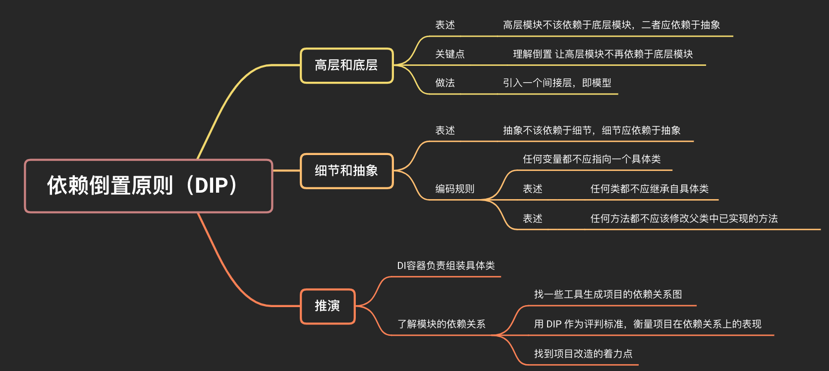 对于任何一个项目而言,了解不同模块的依赖关系是一件很重要的事。你可以去找一些工具去生成项目的依赖关系图,然后,你就可以用DIP作为一个评判标准,去衡量一下你的项目在依赖关系上表现得到底怎么样了。很有可能,你就找到了项目改造的一些着力点。