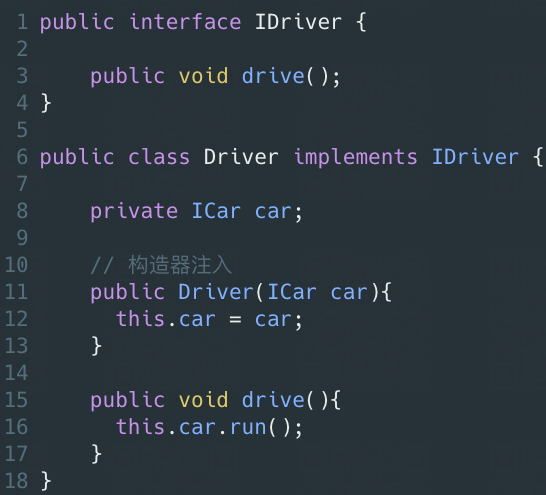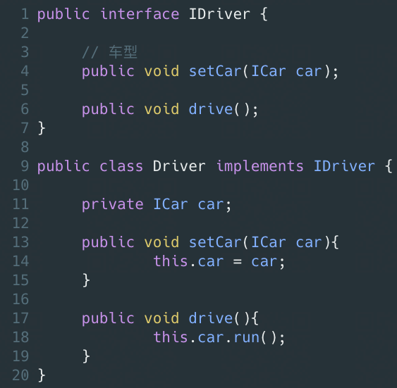 建立两个接口:IDriver和ICar,分别定义了司机和汽车的各个职能,司机就是驾驶汽车,必须实现drive()方法