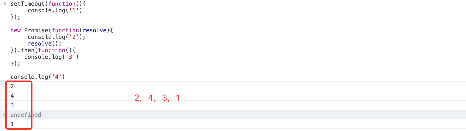 估摸着是这么想的:我难道不知道js是一行一行执行的,setTimeout是异步,所以先放后面;往下走,执行了console.log(2),.then()是异步的,放在后面;走了console.log(4);再去异步队列里走,先是console.log(1);再是console.log(3)。