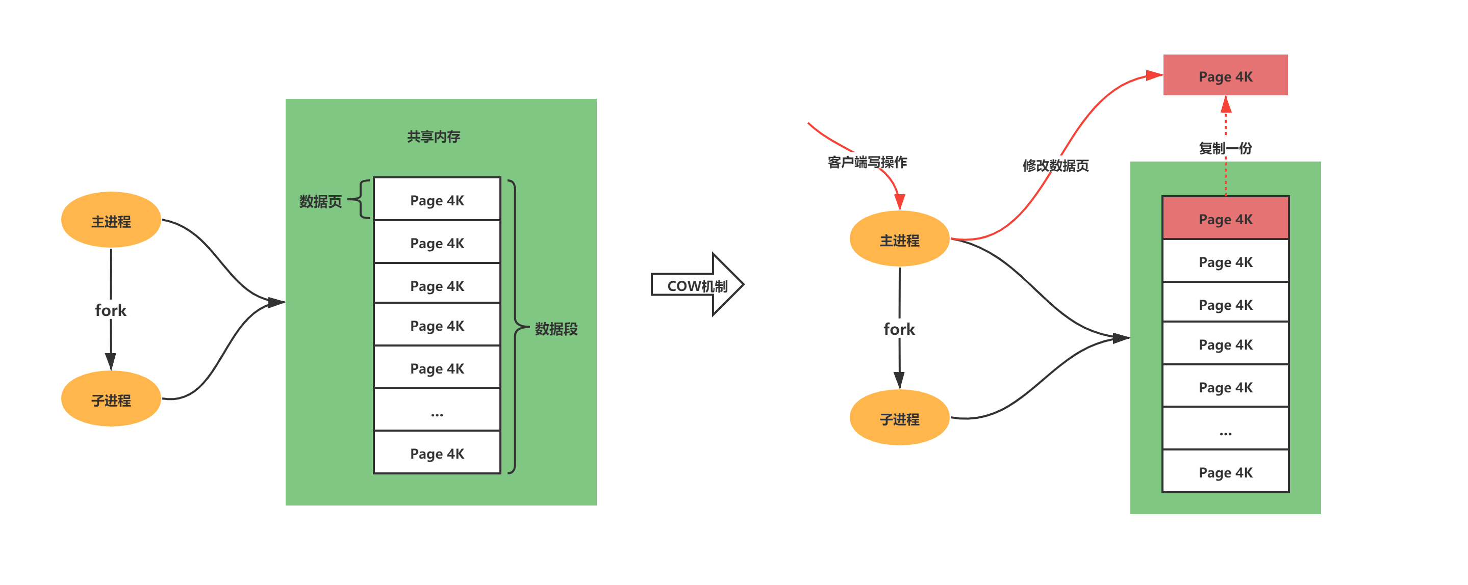 - 出于效率考虑,Linux操作系统中使用COW(Copy On Write)写时复制机制,fork子进程一般情况下与父进程共同使用一段物理内存,只有在进程空间中的内存发生修改时,内存空间才会复制一份出来。
