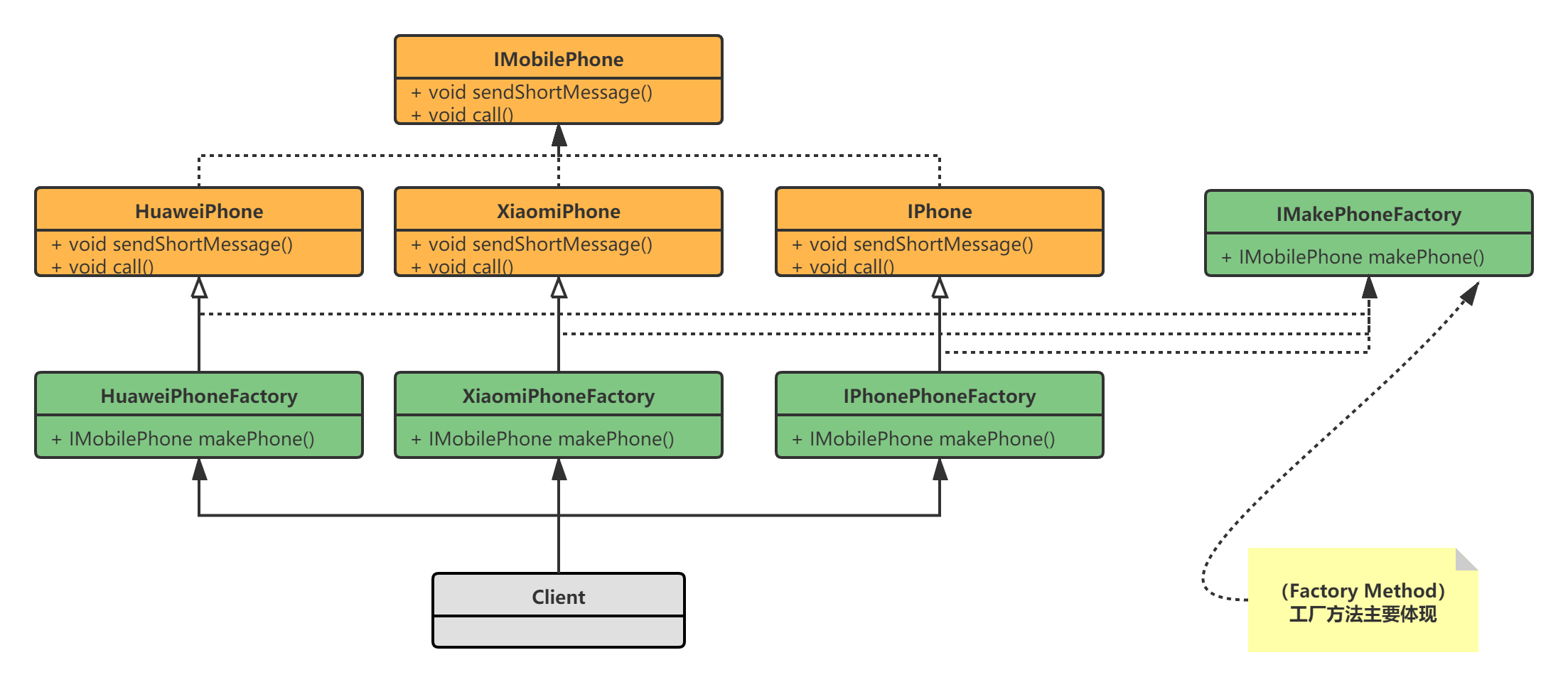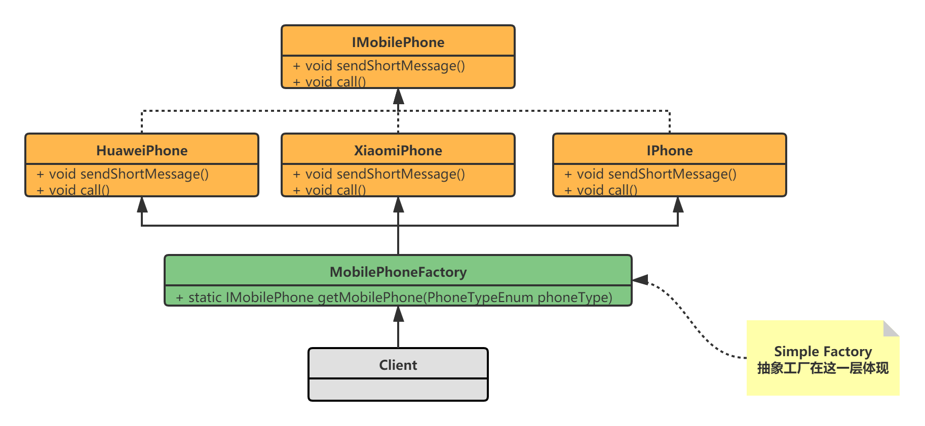 - 简单工厂MobilePhoneFactory用于根据客户端(client)的调用传参创建并返回指定的手机实例对象