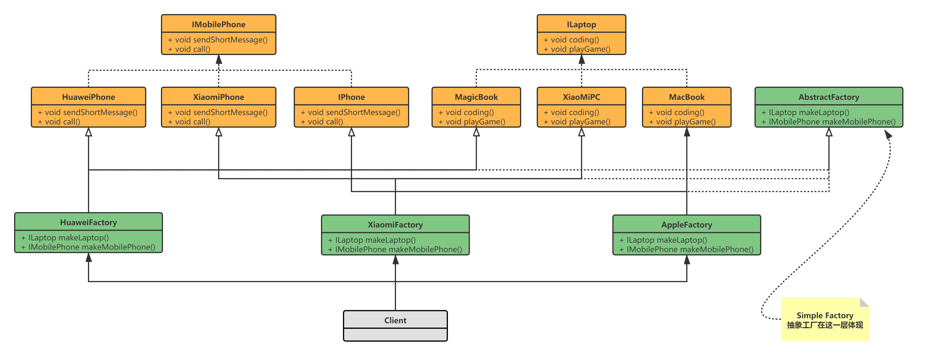 前面有说道,简单工厂就像民间个体作坊,工厂方法就像小型加工厂,而抽象工厂就像大型代工厂。抽象工厂能解决工厂方法中一个工厂无法生产多个产品的问题。