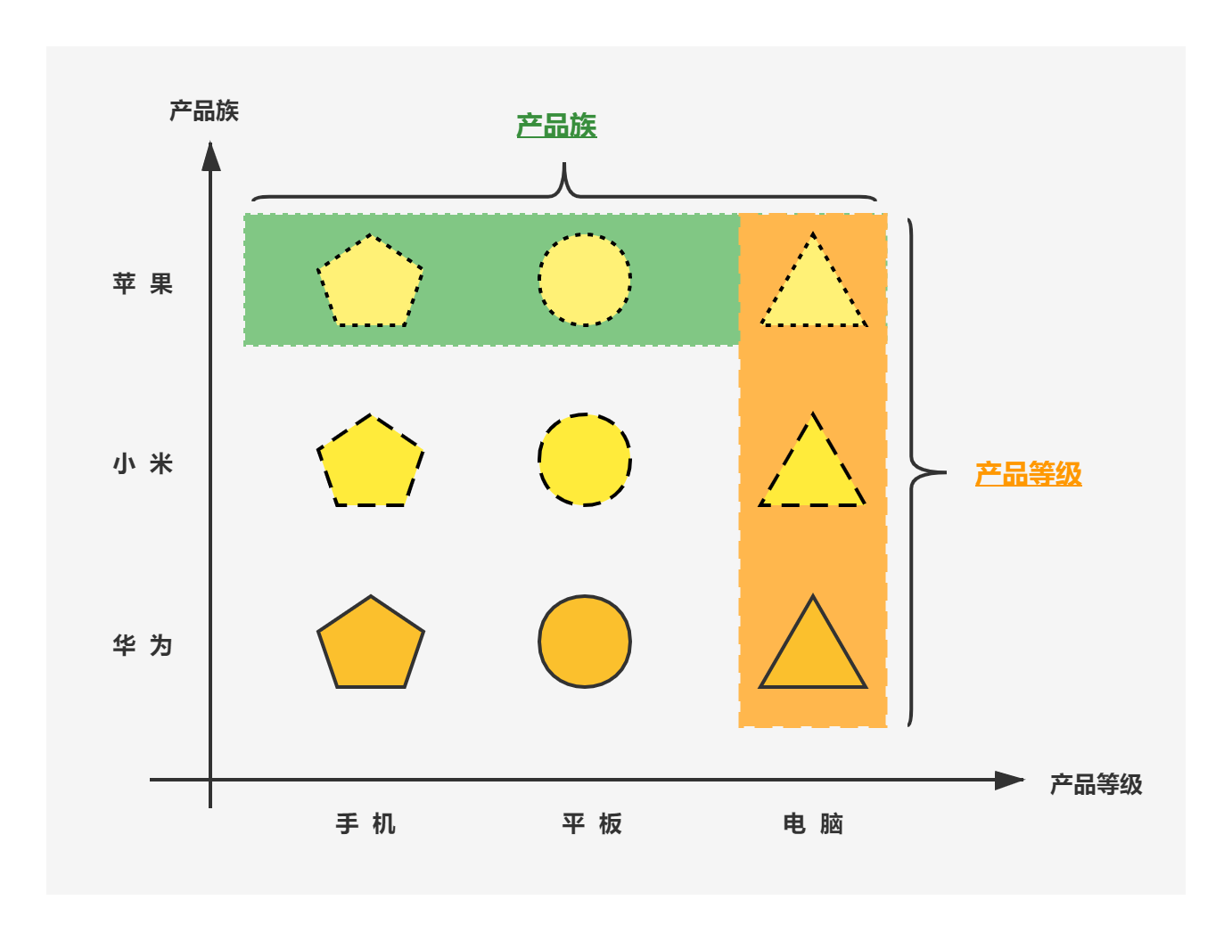 我们知道华为、小米、苹果公司都不仅仅只生产手机;其也生产电脑、平板等各种产品。在上述描述的各种产品中,华为手机、小米手机与苹果手机就是一个产品等级,而华为手机、华为电脑、华为平板就构成了一个产品族。我们通过华为、小米和苹果的各种产品以一张图来示例这二者的关系: