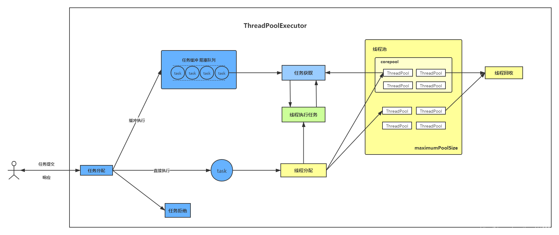线程管理部分是消费者,它们被统一维护在线程池内,根据任务请求进行线程的分配,当线程执行完任务后会继续获取新的任务执行,最终获取不到任务的时候,线程会被回收。