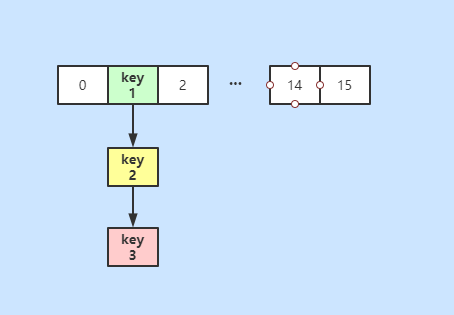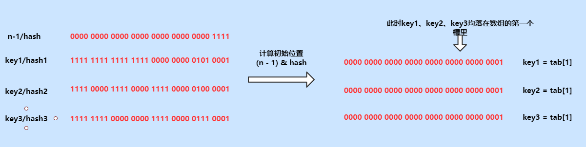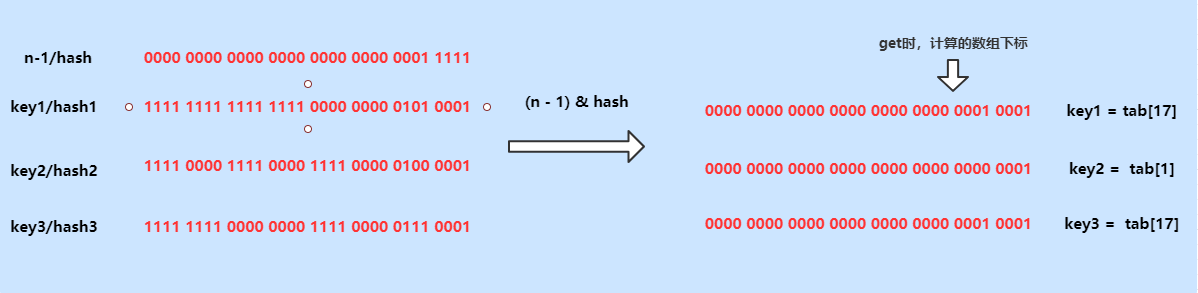 从上面的源代码中我们可以非常明显的看见,获取节点所在数组中的下标的方式也是(n - 1) & hash,与插入节点时计算数组下标的方式是一抹一样的,那此时为何能准确的找到在key1、key2、key3呢?原因就是n的值变为了原来的两倍,而节点的hash值是不会发生改变的,此时计算出来的节点在数组中的位置,与我们在扩容时,进行的节点移动操作(也可以理解为重新计算数组中的索引)是一致的;我们可以通过get时,计算key1、key2、key3的索引来展示效果,如下