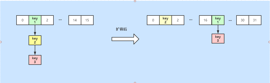 扩容的算法为 e.hash & oldCap,计算后发现key2的值为0,维持在老数组中下标位置,key1和key3需要转移到j + oldCap的位置,也就是1+16=17下标位置上