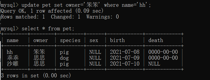 比如说更改owners下的川川为笨笨,就执行:update pet set owner='笨笨' where name='hh';