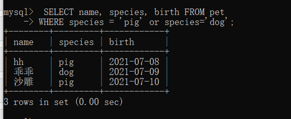 可以组合条件,例如找出思思的狗:select * from pet where owner='思思' and species='dog';