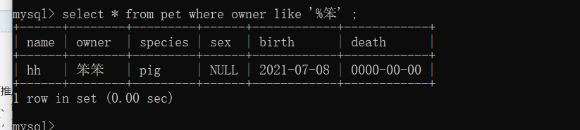 要想找出包含“h”的名字: SELECT * FROM pet WHERE name LIKE '%h%';