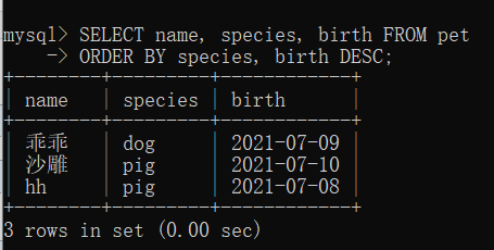 按升序对动物的种类进行排序,然后按降序根据生日对各动物种类进行排序(最年轻的动物在最前面),使用下列查询: