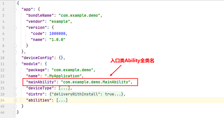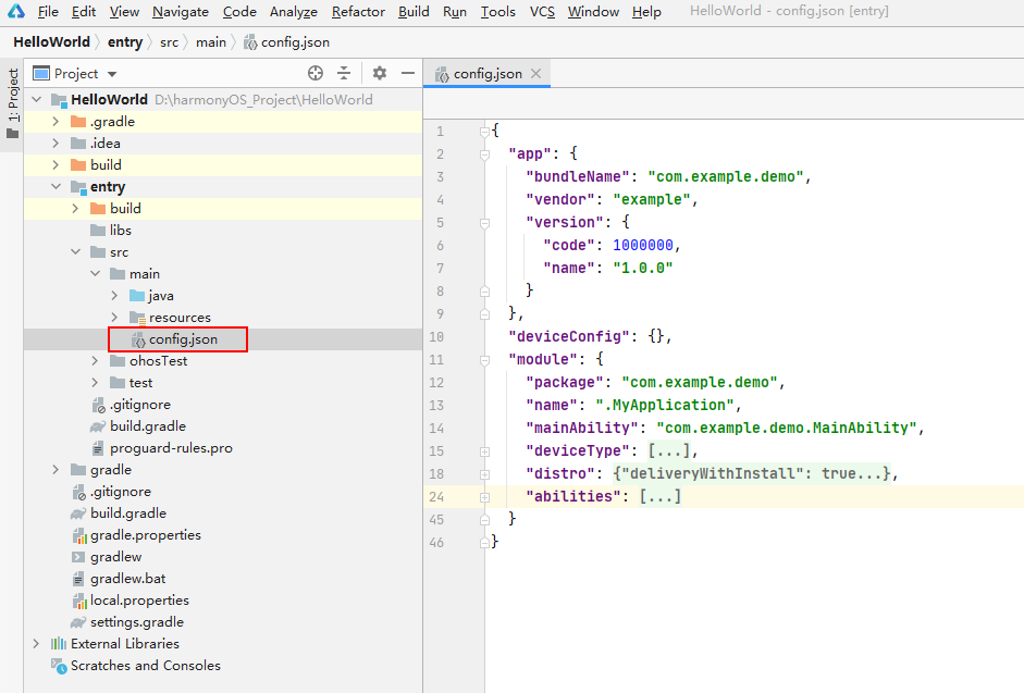 config.json文件是HarmonyOS(鸿蒙)应用程序的主要配置文件,其位于entry -> src -> main -> config.json,配置文件分为三大块,具体的说明可以参考我的另一篇文件,《HarmonyOS(鸿蒙)——config.json详解》