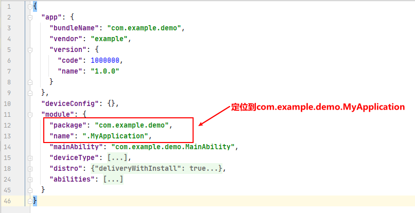 初始化主要通过config.json的module下的package和name来定位类com.example.demo.MyApplication.