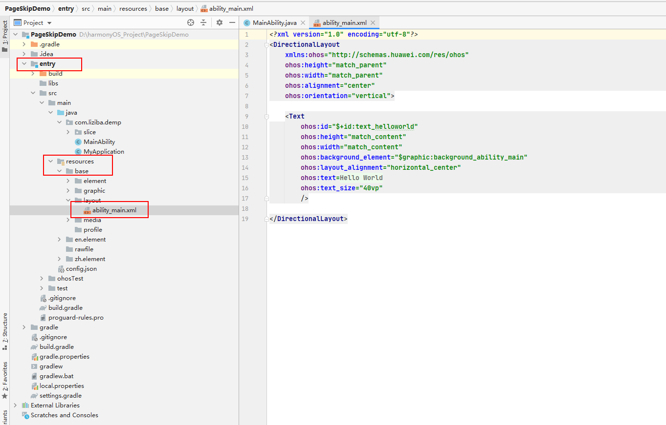 - 在Project窗口中,点击entry -> src -> main -> resources -> base -> layout -> ability_main.xml文件,可以看到如下代码
