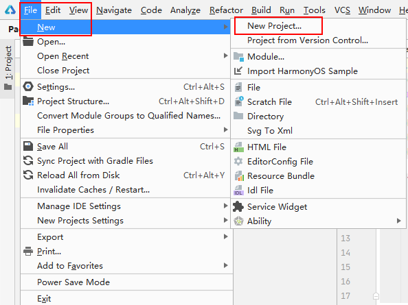 - 打开编辑器DevEco Studio创建一个工程,选择File -> New -> New Project