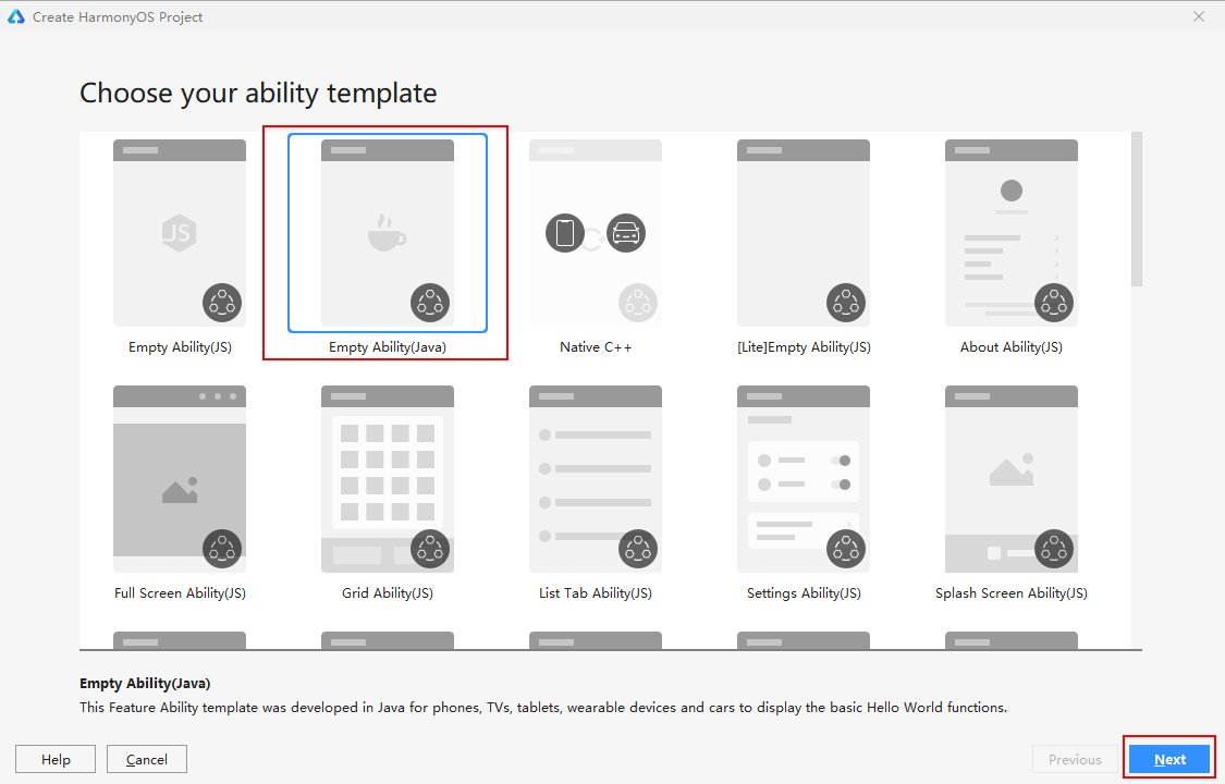 - 在Choose your abilitu template 页面选择Empty Ability(Java),然后点击Next