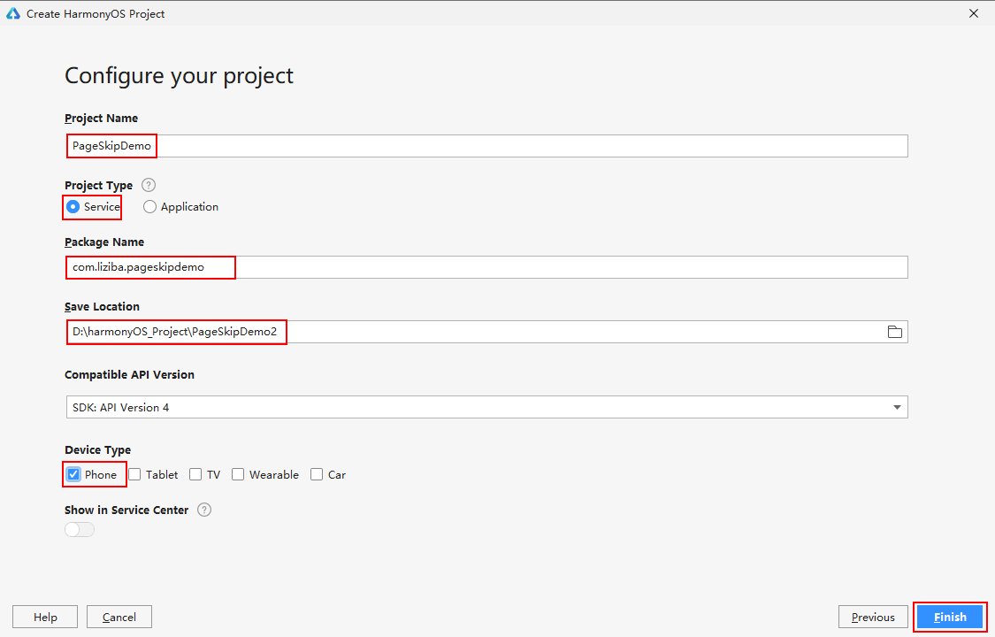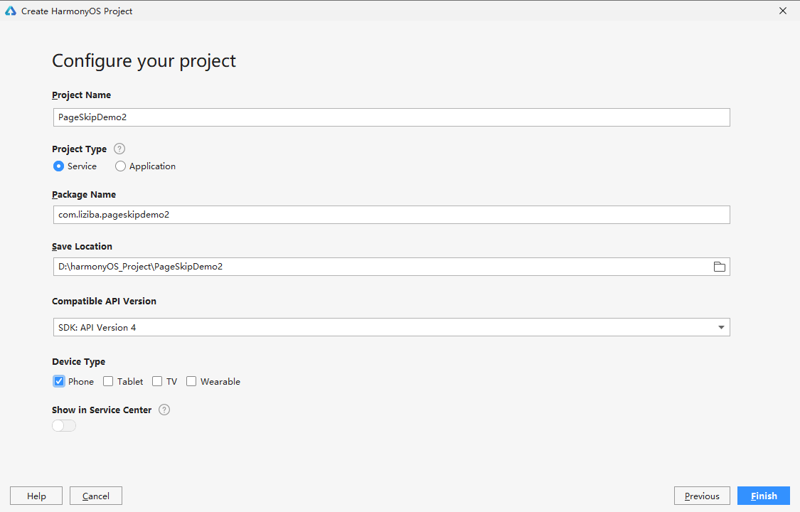 - 配置项目的相关信息,包括Project Name、Project Type、Package Name、Save Location、Device Type等信息,最后点击Next即可