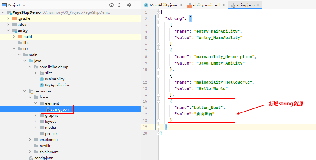 - (可选)如果需要引用String资源推荐在"string.json"文件中进行配置,在Project窗口中,点击entry -> src -> main -> resources -> base -> element -> string.json文件,新增button——Next按钮资源