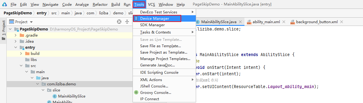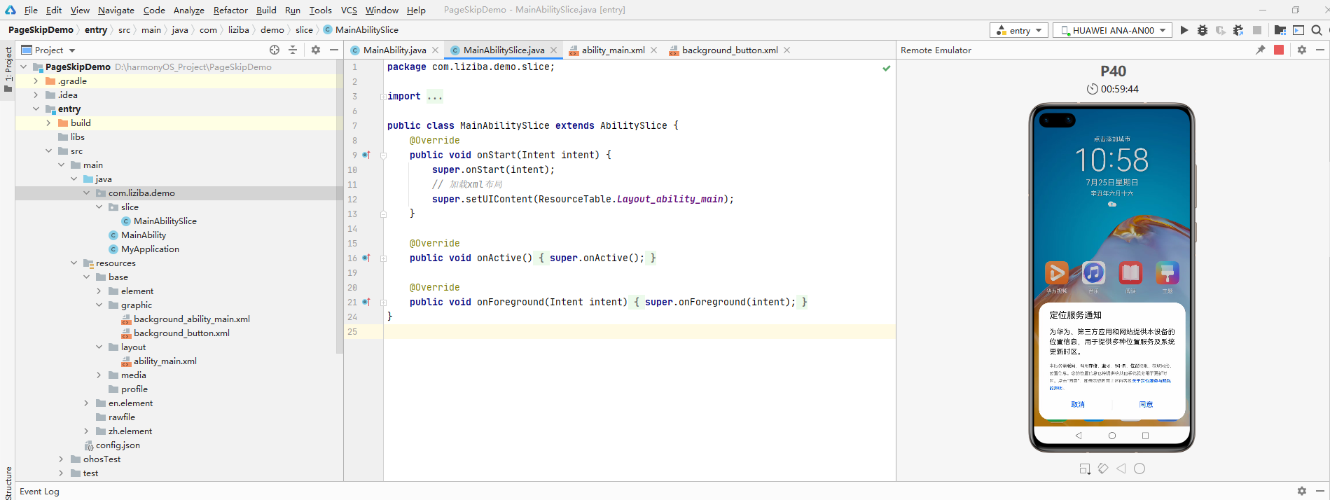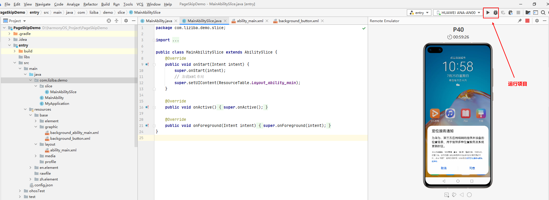 打开MainAbilitySlice.java类,新增按钮点击后页面跳转功能