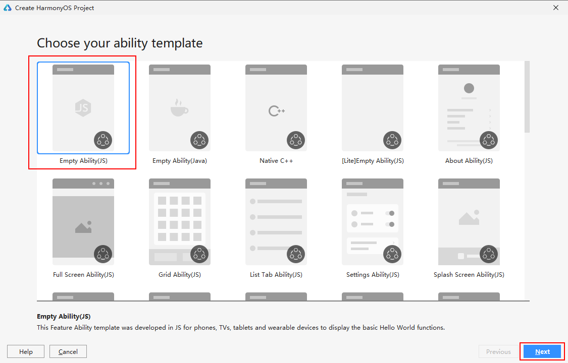 - 在Choose your abilitu template 页面选择Empty Ability(JS),然后点击Next