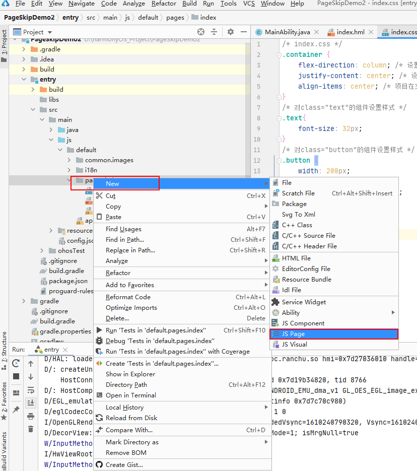 打开entry -> src -> main -> js -> default -> page.index,右键New -> JS Page