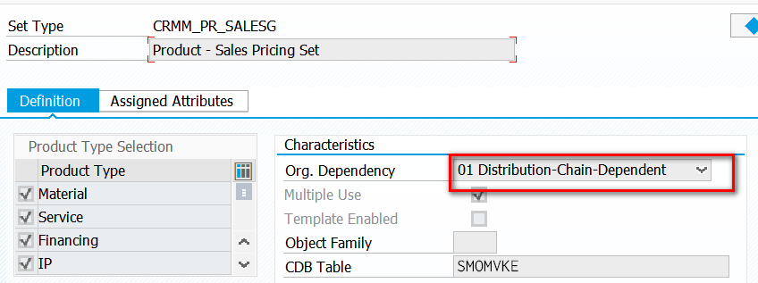 那么为什么从业务上来说,每当一个订单的Organization Model组织架构数据发生变化之后,就需要调用这个回调函数呢?打开这个函数的源代码,在102行看到了CRM Product的settype之一, CRMM_PR_SALESG(Set type allowing you to group products for various purposes. As this set type is dependent on distribution chains, a distribution chain has to be selected before data can be maintained)的数据被读取。