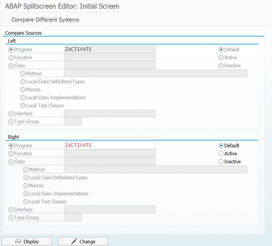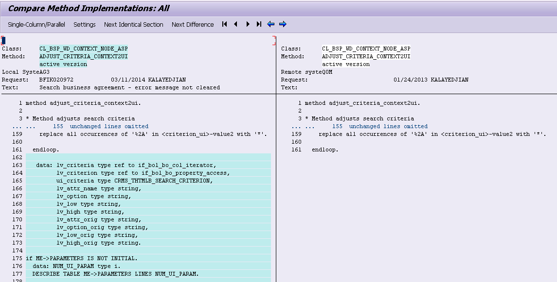 假设我想同时显示系统A和系统B上的一段ABAP代码,使用菜单Versions->Version management: