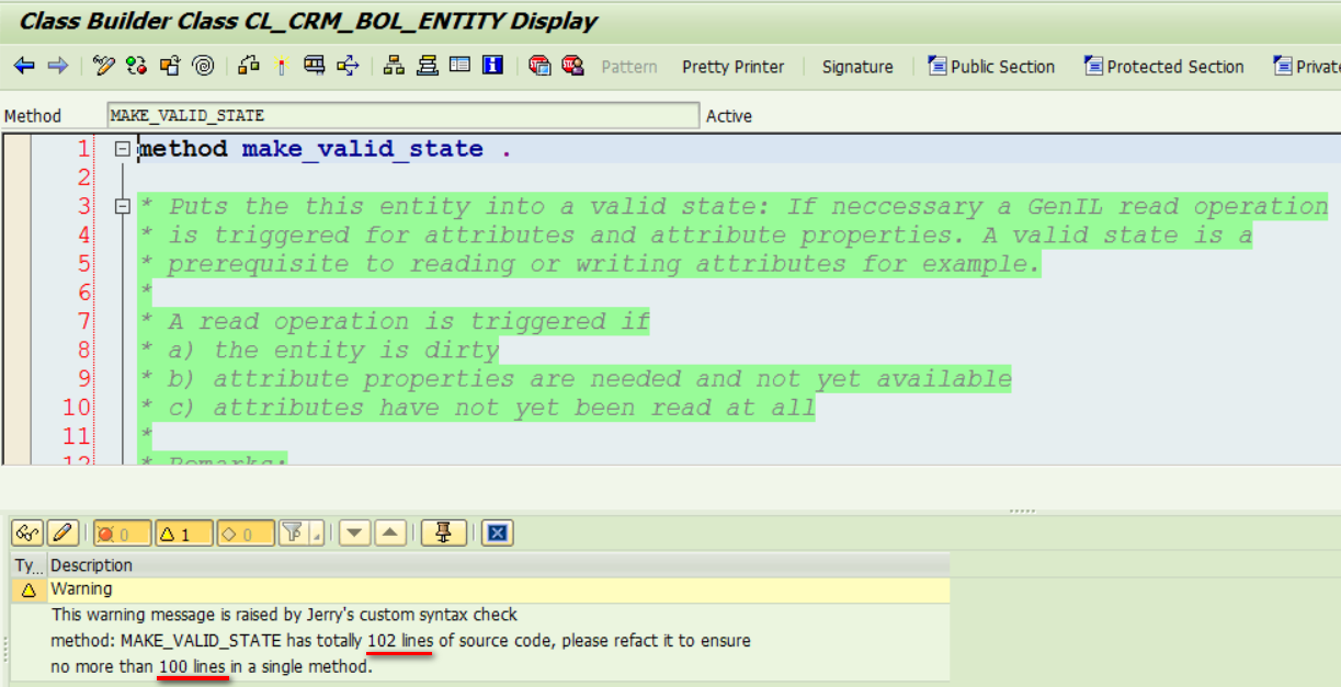 如果需要实现SAPGUI里自定义的语法检查,比如,某团队强制要求应用程序类的每个方法的实现代码不能超过100行。如果超过,报下列的警告信息。