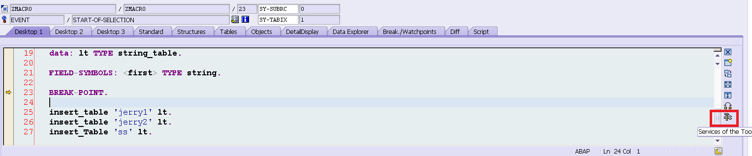 比如我写了下面一段宏,名为insert_table. 执行这段代码,调试器会在第23行停下来。