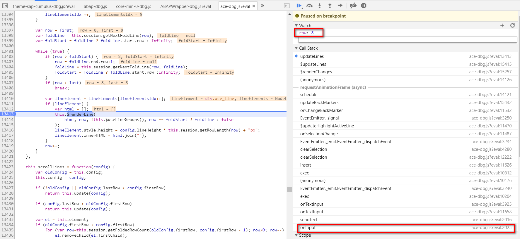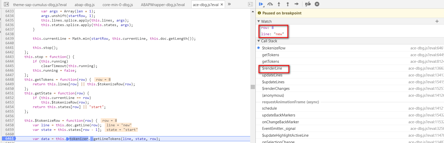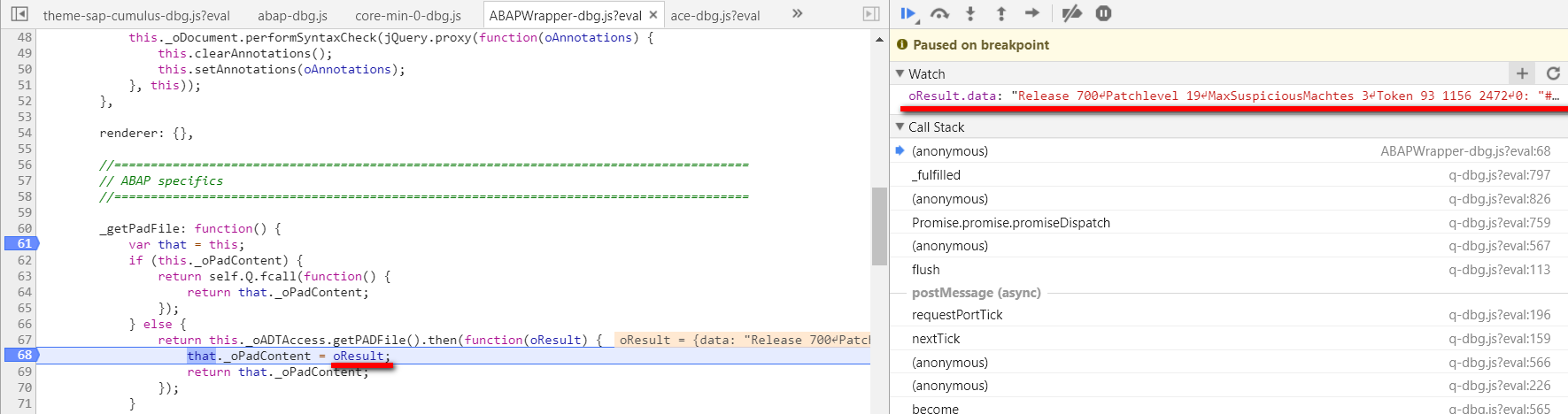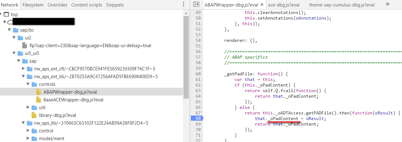 打开ABAPWrapper-dbg.js, 在第68行设置断点。这个函数负责从ABAP后台取PAD文件,该文件和语法高亮有关。
