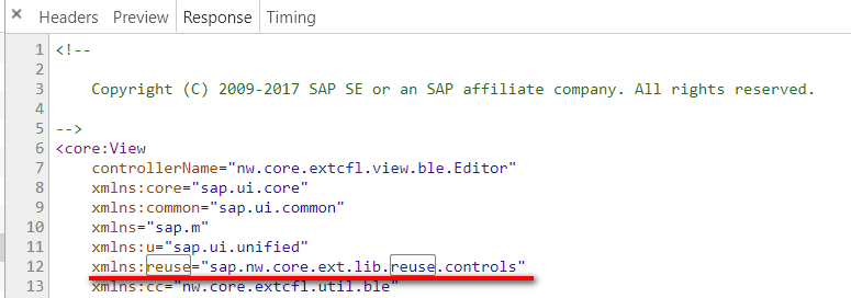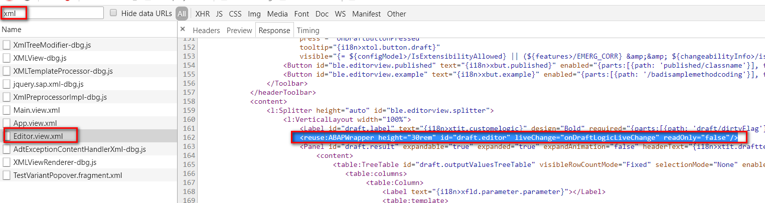 (2). 现在需要找到浏览器里进行ABAP代码编辑的编辑器的实现。在Chrome开发工具里Network tab里输入“.xml”作为过滤条件,于是找到编辑器的Fiori实现: Editor.view.xml