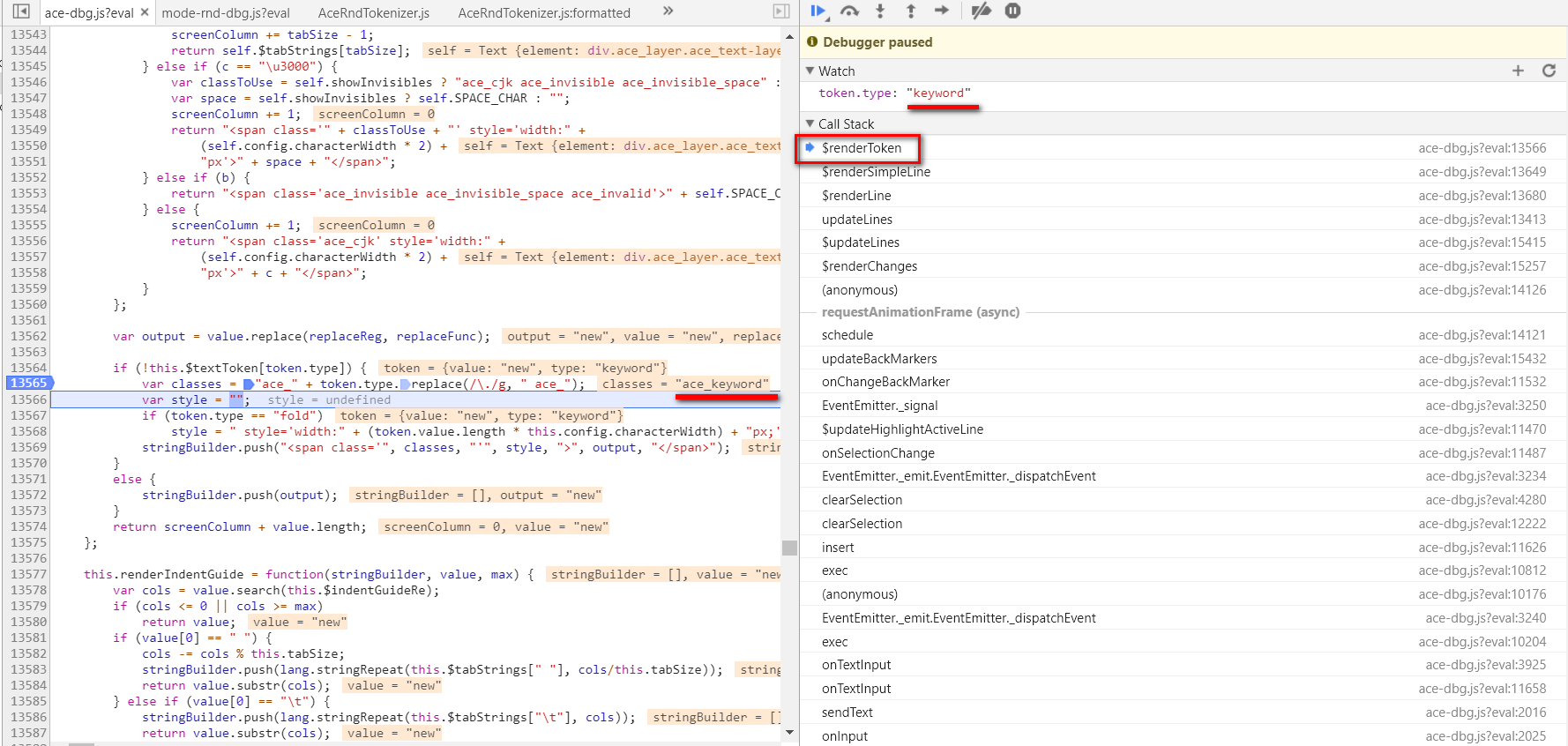 (4). DOM节点的源代码在此处生成,"ace"和“keyword"做连接操作,生成最后我们在Chrome开发工具里看到的完整css类ace_keyword.