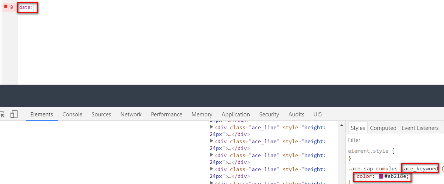 (1). 在浏览器里敲个ABAP的关键字,比如data。发现被高亮了。通过Chrome开发工具发现高亮是通过一个叫ace_keyword的css类实现的。